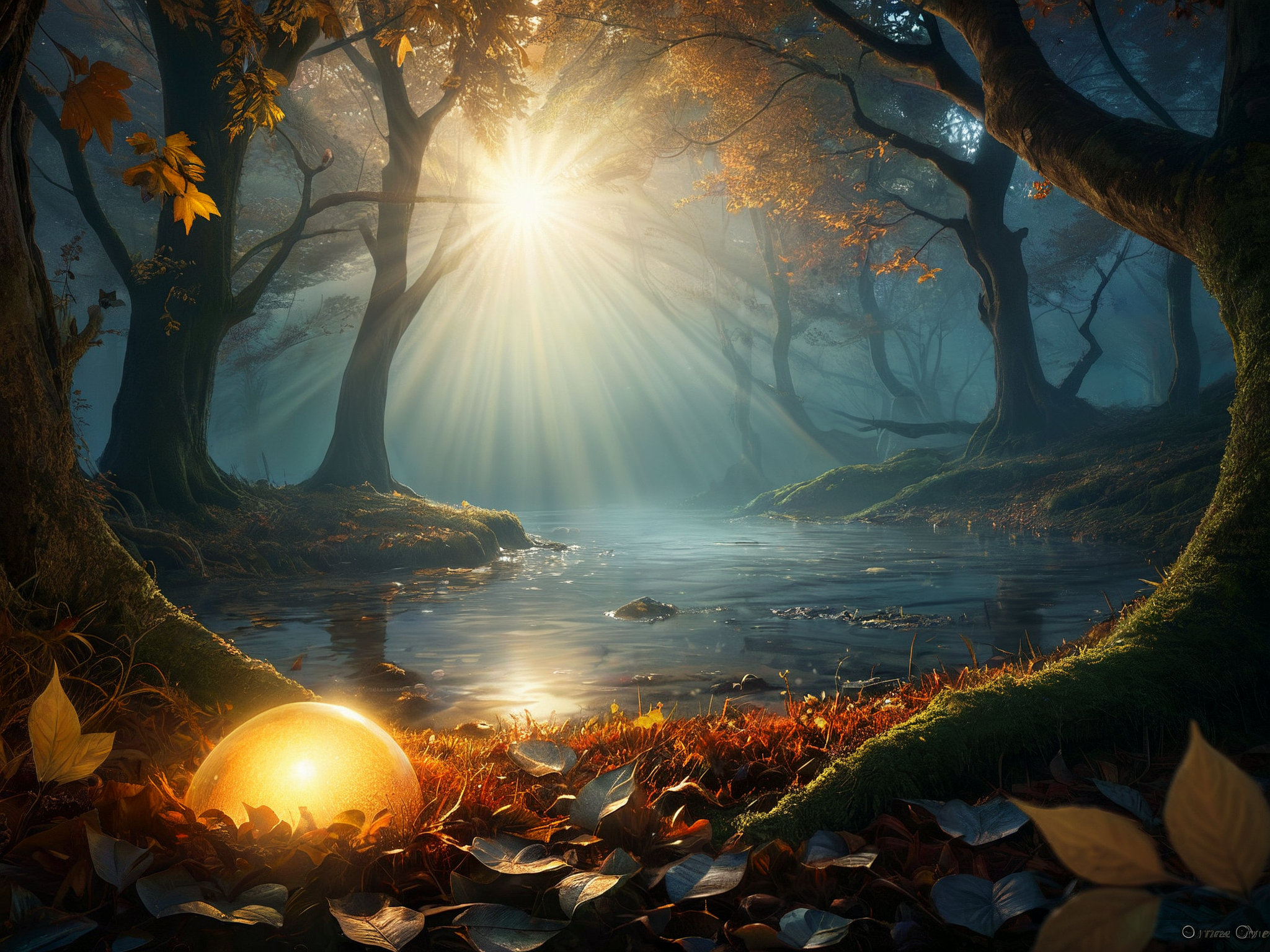 Beneath the restless leaves, bedewed and quiet, lies a mysterious object, long forgotten. It shimmers in the morning light, a quiet spectacle waiting to be found, glittering as the sun rises. fantasy style, dreamlike fantasy art, <lora:RMSDXL_Enhance:1>, <lora:add-detail-xl:0.8>, <lora:RMSDXL_Darkness_Cinema:1>,
