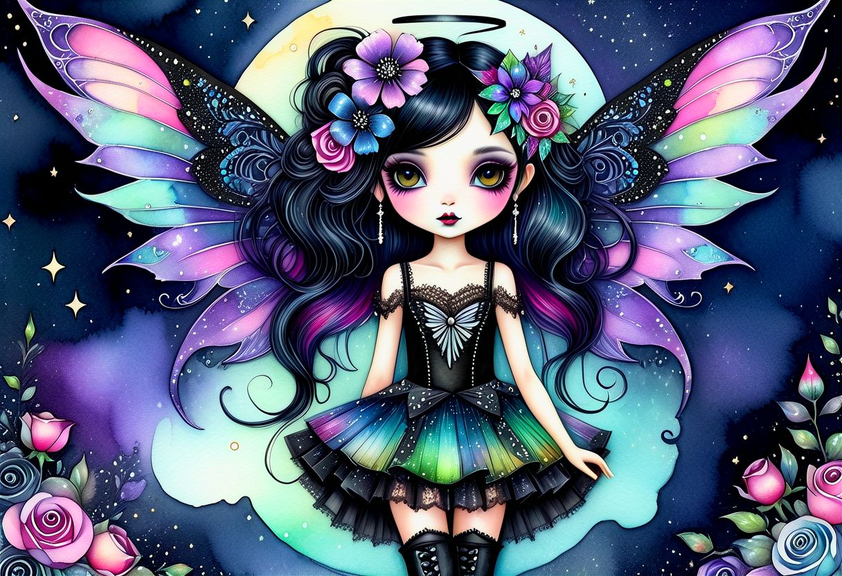 watercolor greeting card style of a 35 k ultrarealistic whimsical little gothpunk fairy with punkstyle black hair with colorful highlights, coherent delicate detailed face, wearing a beautiful blacklace midi dress, black platform boots, iridescent black colorful wings, decorated with glitter, sparkles, black roses and peonies, ribbons, pearls , embossed high raised with pearl, and intricate patterns night watercolor night background, in the style of Gorjuss, Joan Walsh Anglund,soft-focus and diffused lighting akin to Paolo Roversi, imbued with Tim Burton's macabre touch, Kris Kuksi-like intricate background detail, digital painting, ultra-detailed, cinematic