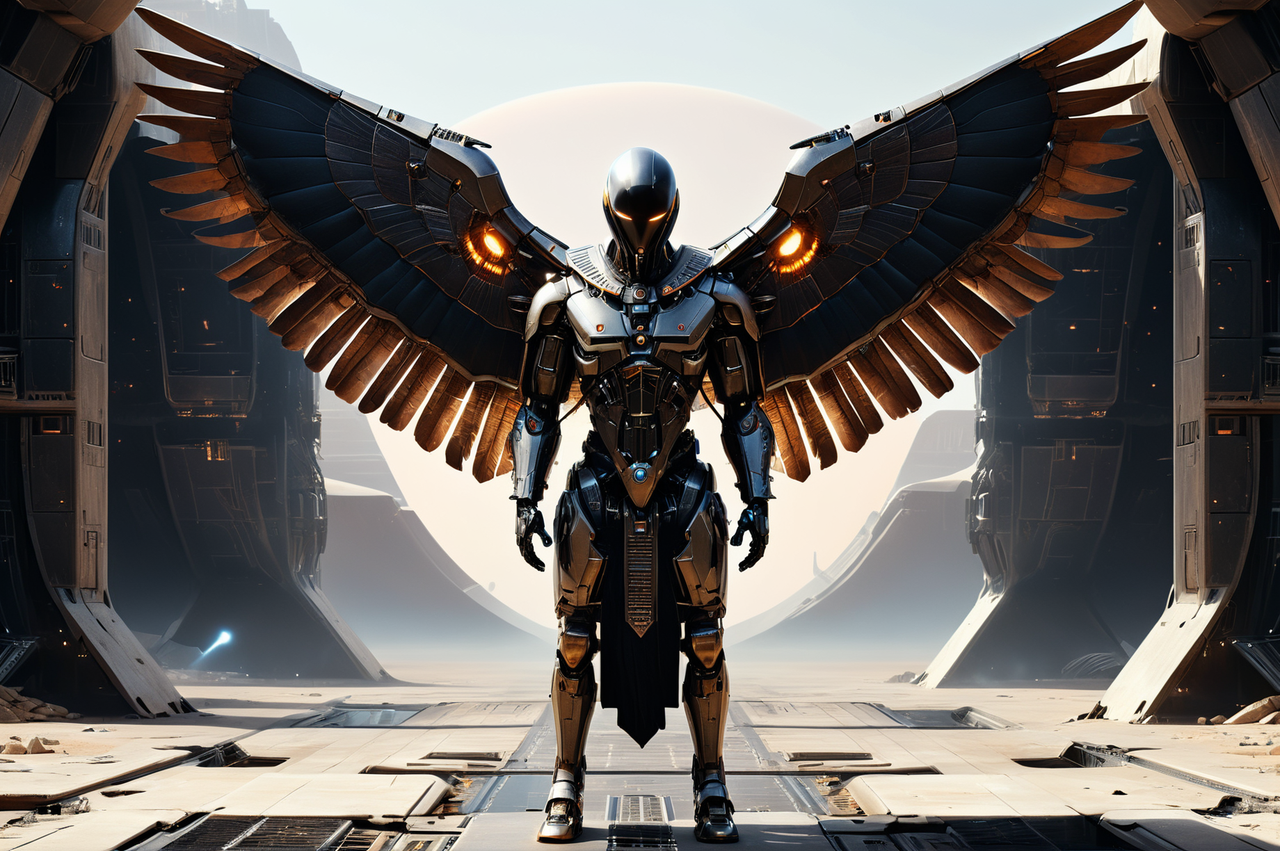 photorealistic, detailed digital illustration of a <lora:EgyptPunkAIp:0.8> egyptpunkai cyborg with massive wings, <lora:Faceless_Cyborgs-000014:0.7> noface, cyborg, at a Barren space habitat with abandoned modules <lora:xl_more_art-full_v1:0.4>, Firelight