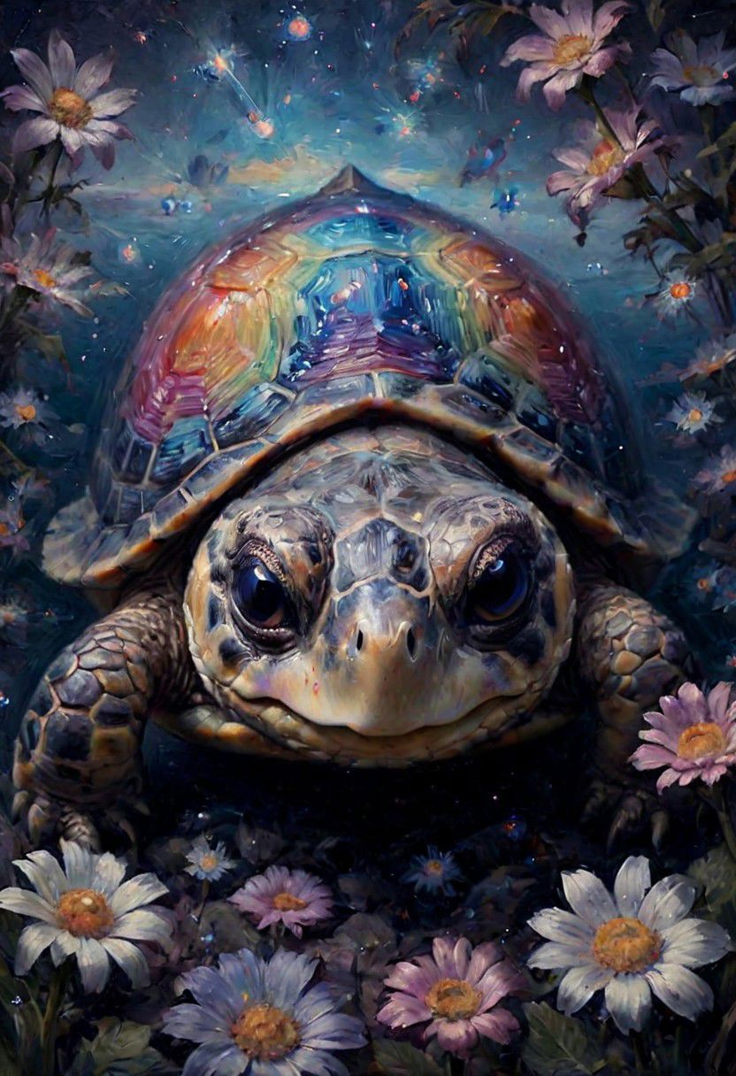 atmospheric oil painting of a hyper-real portrait of a hauntingly beautiful pale pastel rainbow scaled turtle with huge watery eyes sorrow flowers and crystalline structures photo-real pastel galaxy stars