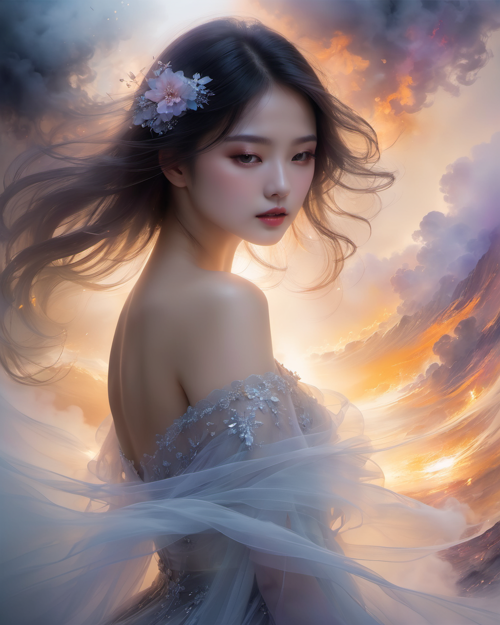 1girl (bare shoulders:0.85), seductive, semi transparent dress, surrounded by fog (detailed skin, Glowing ambiance, enchanting radiance, luminous lighting, ethereal atmosphere, mesmerizing glow, evocative hues, captivating coloration, dramatic lighting, enchanting aura),(in smoke:1.1),(dynamic smoke anywhere:1.4)weak temperament, epic cinematic, soft nature lights, rim light, absurd, amazing, intricate, hyper detailed, ultra realistic, soft colors, (best quality, masterpiece, Miho Hirano Scott Naismith )