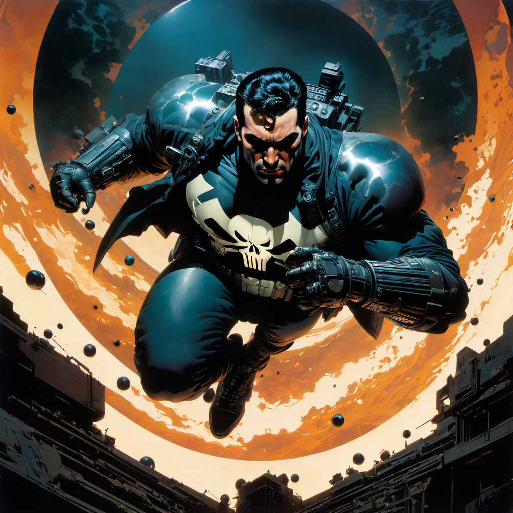 Punisher jumping through a portal, sfumato, polaroid, wormcore, cover art for wargame, technocybernetics, a gothic image, mind-blowing detail, greatly detailed, line art, small pebbles scene, mesozoic era, 1990s era, contre-jour lighting, gloomy lighting, mechanical parts, psycho mechanical, a pin up portrait, a full length portrait, mandelbox scene, kaleidoscope scene, transistorpunk, a religious sci-fi, Artwork by Saul Tepper, Artwork by Hiroshi Takashige, cosmicwave scene, spiritwave scene