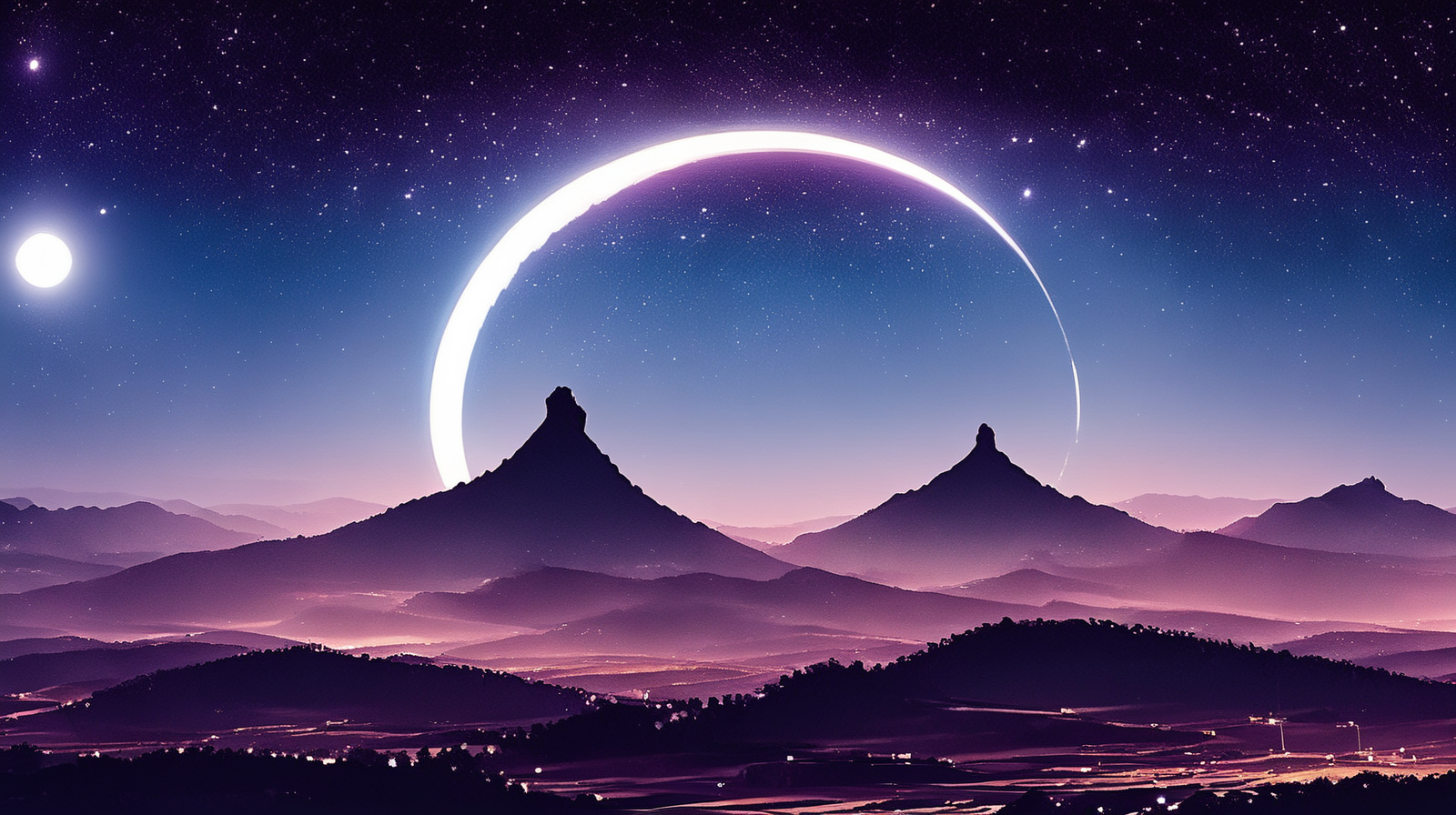 eclipse,outdoors,sky,no humans,night,moon,star (sky),night sky,scenery,full moon,starry sky,mountain,silhouette,crescent moon,landscape,mountainous horizon,hill , <lora:Eclipse:1>