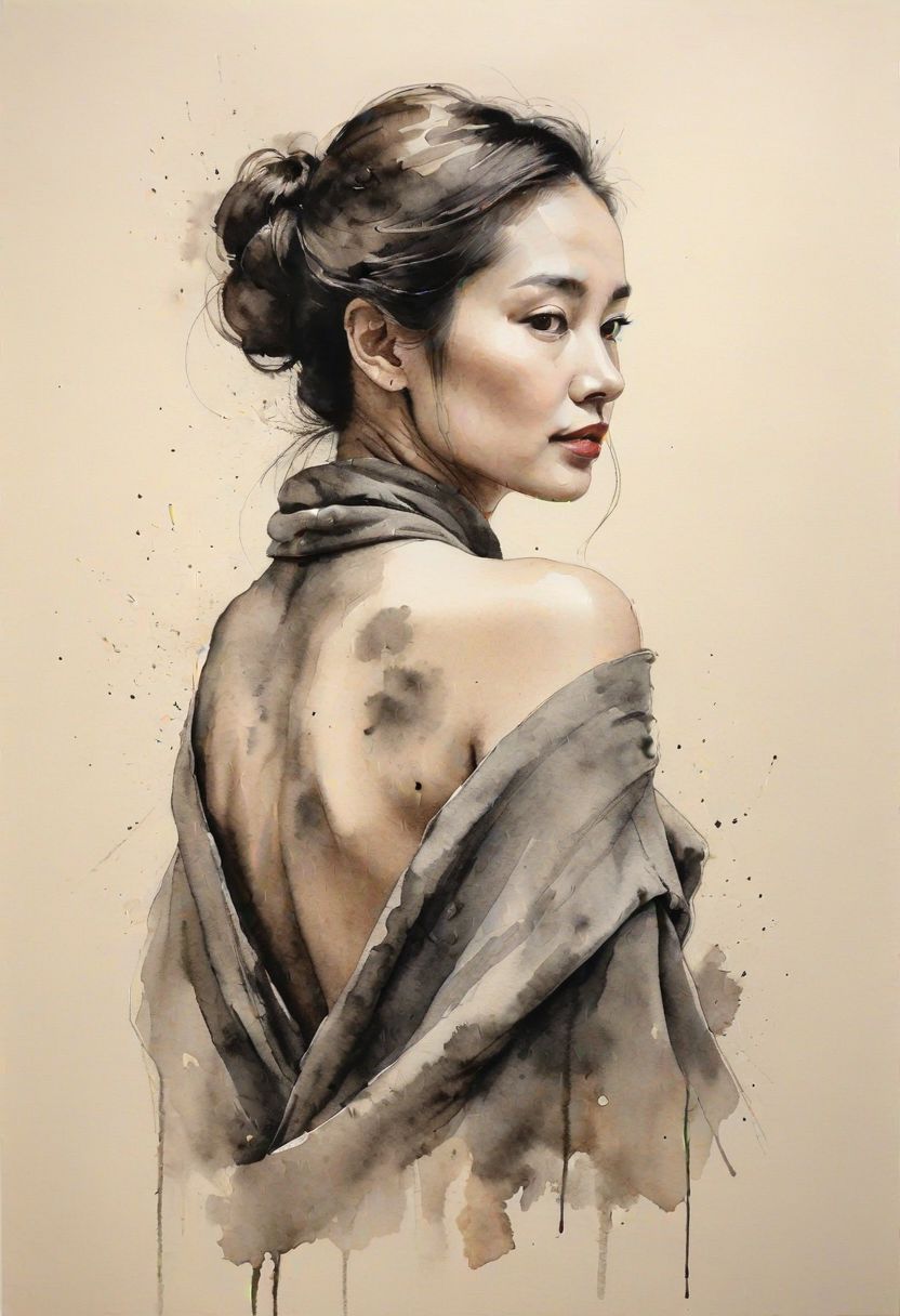 Over the shoulder Portrait of a Lady, ink painting, simple naturism, semi color painting, centered with margin, detailed, charcoal stains, beautiful dynamic lighting, detailed