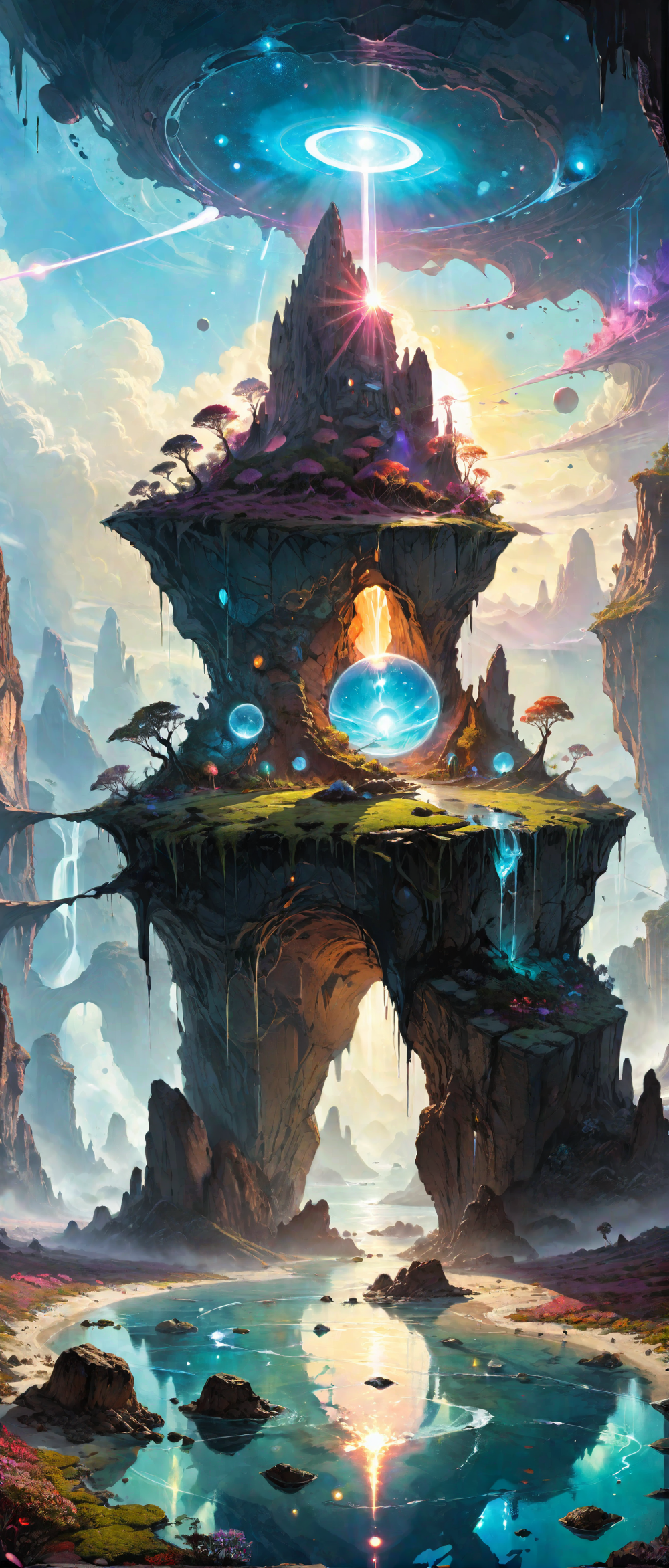 Visualize an otherworldly scene: a rift between dimensions situated on a floating island amidst an alien planet's surreal landscape. Imagine the rift as a crackling tear in reality, emitting an eerie glow amidst towering rock formations and vibrant flora. Capture the sense of wonder and unease as the island hints at the mysteries of interdimensional travel and the unknown realms beyond, Ink, Concept Art, Lens Flare in David Mack, Greg Rutkowski, Obey style, Psychedelic, surreal, masterpiece, trending on artstation, <lora:xl_more_art-full_v1:.7>, <lora:Dreamyvibes - Alt-Version - Trigger is Dreamyvibes Artstyle:.7> Dreamyvibes Artstyle