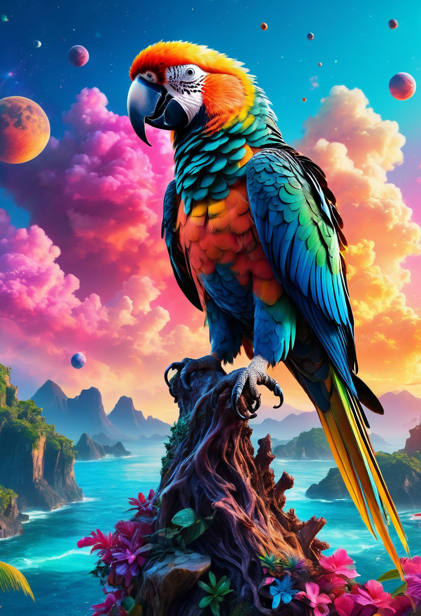 ((masterpiece, high quality, best quality, 8k, wallpaper, fine lineart, highly detailed, absurdres)), cinematic photo magical style land art style hyperrealistic,( vaporwave:1.3),vivid colors, intricate details, realistic style, oil paintings, acrylic paintings, watercolor paintings, digital illustrations, mixed media pieces, sculptures casting shadows,( cosmic sky:1.2), scifi landscape, photorealistic,extreme detail,lifelike,crisp,precise. natural materials,outdoor,detailed blend of organic and magical elements,futuristic,legendary,detailed,intricate,,film,bokeh,professional,4k,highly detailed, in the style of art, colorful, phone wallpaper,a pirate with a parrot,