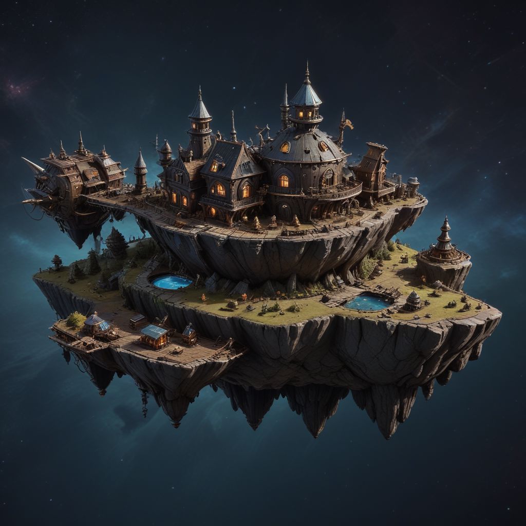 lumenarium, floating island at space, realistic, foto from space, small town on it, some flying ship around, fantasy, isometric view