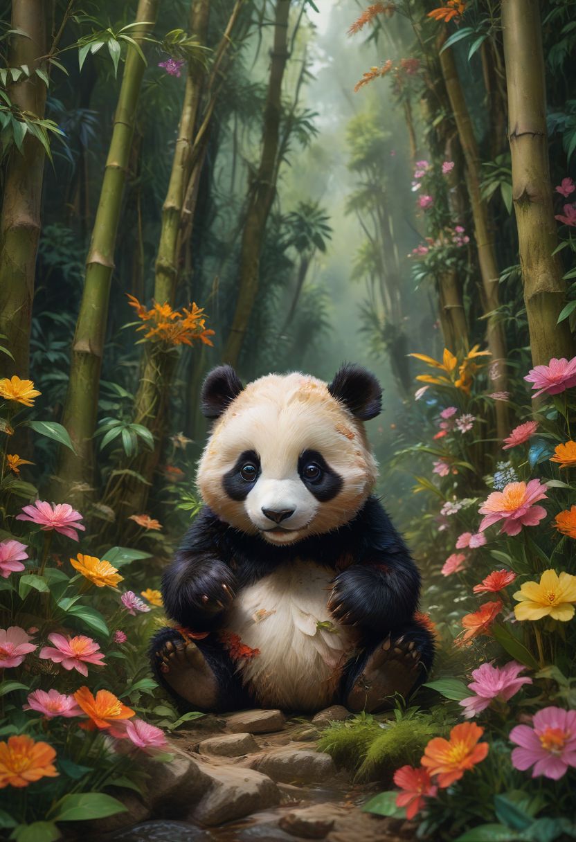 A playful panda, its fur adorned with patches of vibrant flowers, rolls playfully in a bamboo forest, its movements full of childlike glee.