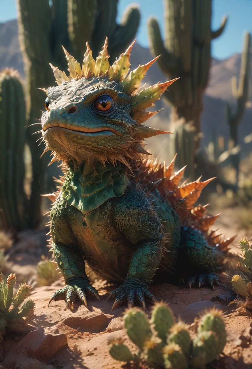 A hybrid creature, combining the features of a lizard and a cactus, basks in the desert sun, its spikes gleaming with a menacing aura.
