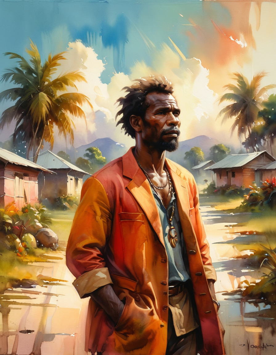 art by Horia Bernea, painting, landscape of a ([Melbourne:Papua New Guinea:2]:1.1) , wearing ral-wtrclr, Clear skies, Romanian modernism, rural landscapes, poetic compositions, earthy color palettes, atmospheric lighting, painterly, <lora:ral-wtrclr:0.88>, colorful, perfect background, fine detail, background inspired, theatrical, luxury