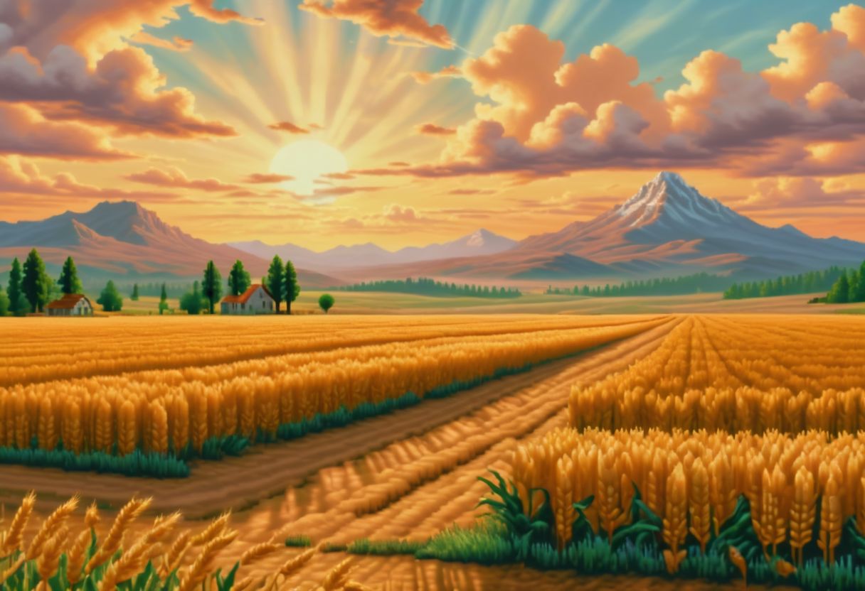 lcas artstyle, fluffy clouds, big open field, wheat fields, a forest, tall mountains, plains, whimsical, golden hour, long shadows