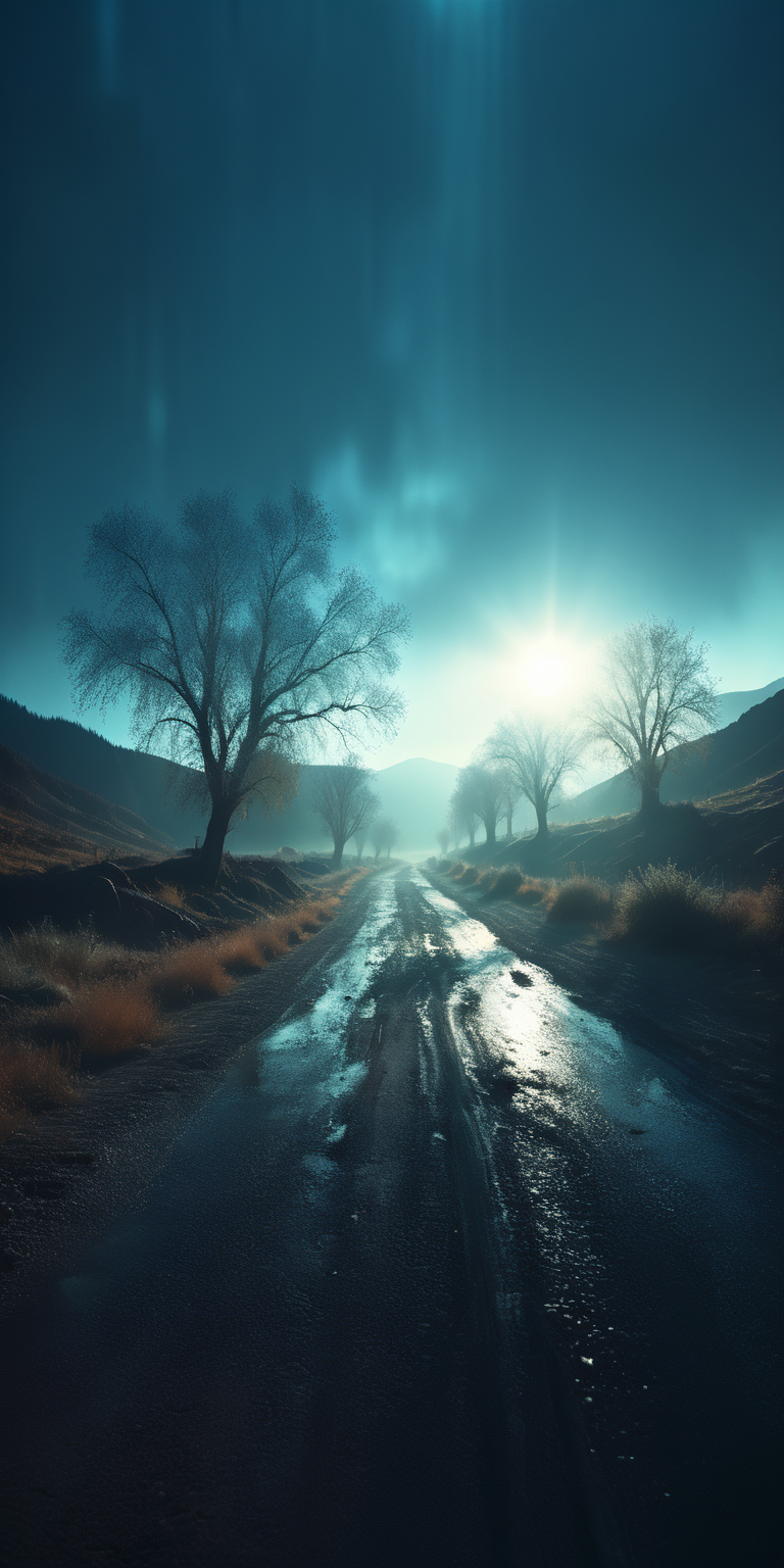 (8k analog photo,strange landscape:1.2), a dirt road in a serene valley with glittering trees all around, <lora:M05_Intensify:1>