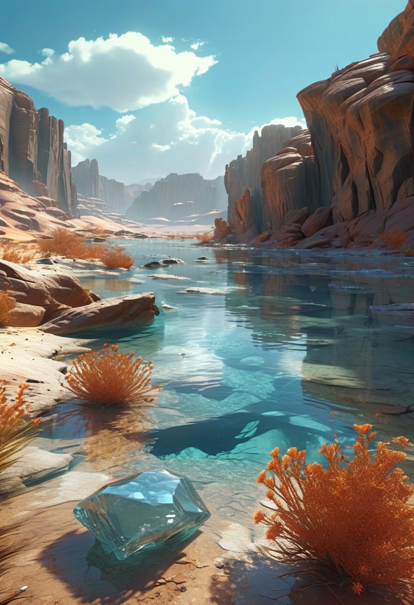 (ultra high res:1.4), (masterpiece), (beautiful lighting:1.4) , shattered plains, desert landscape, sand Mountains,desert plants, sunlight setting illuminates the crystal-clear water oasis (deep underwater), anime, half above water and half below water, (clear underwater), beautiful sky with clouds and smoke, desert animals and water creatures, depth