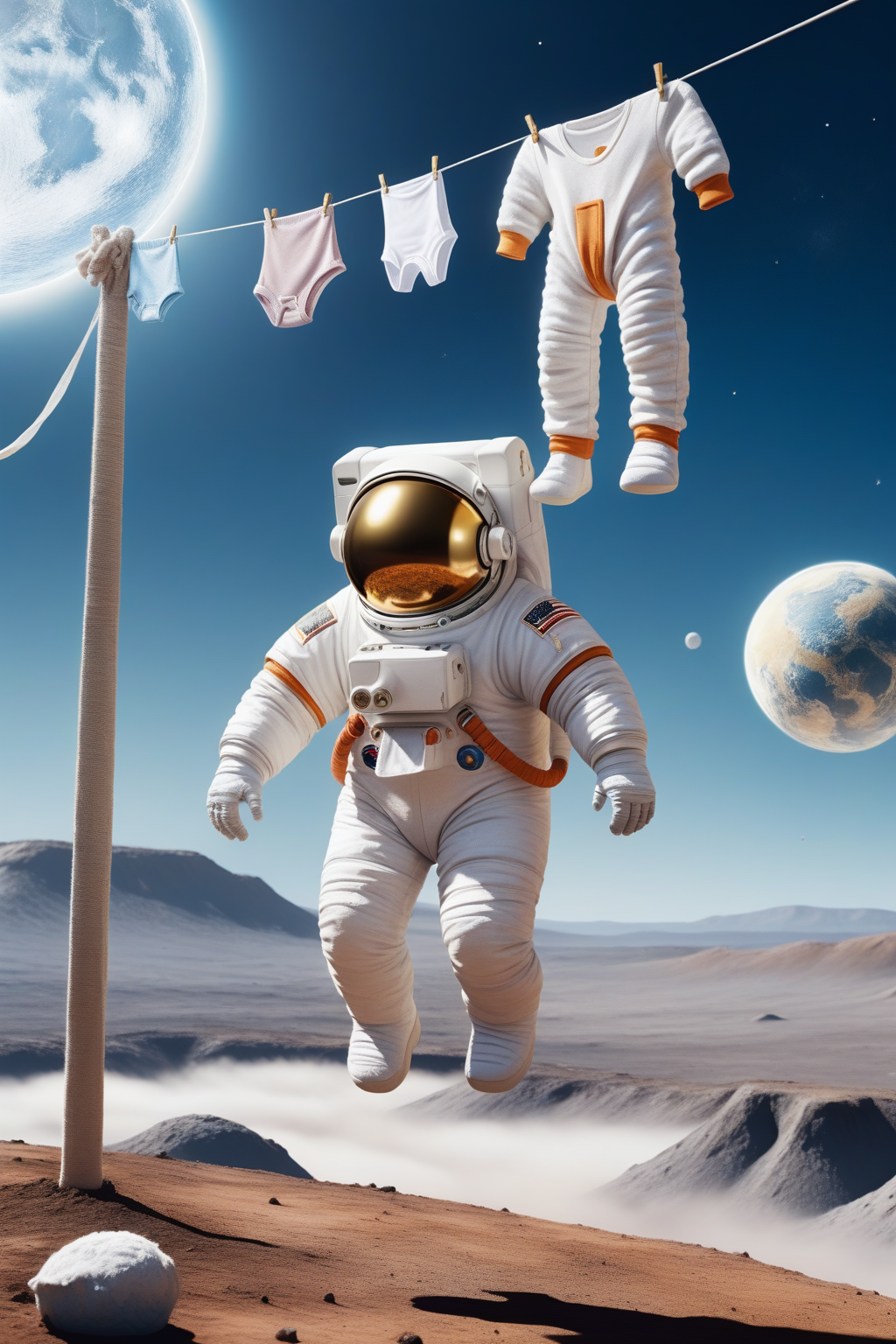 (best quality, masterpiece:1.2),astronaut hanging laundry on moon,in space suit,underwear billowing gently on washing line,bright sunny day,craters in background,Earth rising over horizon,whimsical,(smiling:1.1),humorous scene,