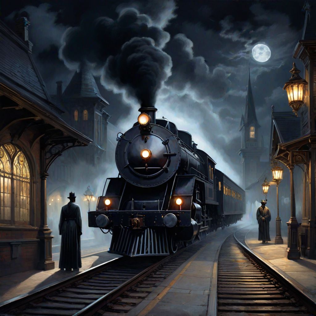 a black American steam train, arrives at a Gothic-style train station, moonlit night. This painting is imbued with a strange atmosphere, flickering lanterns that only partially pierce the oppressive darkness. Silent characters barely visible in the murky darkness wait for the train to arrive. They wear ancient clothing, their faces obscured by the shadows and the disturbing darkness of the full moon