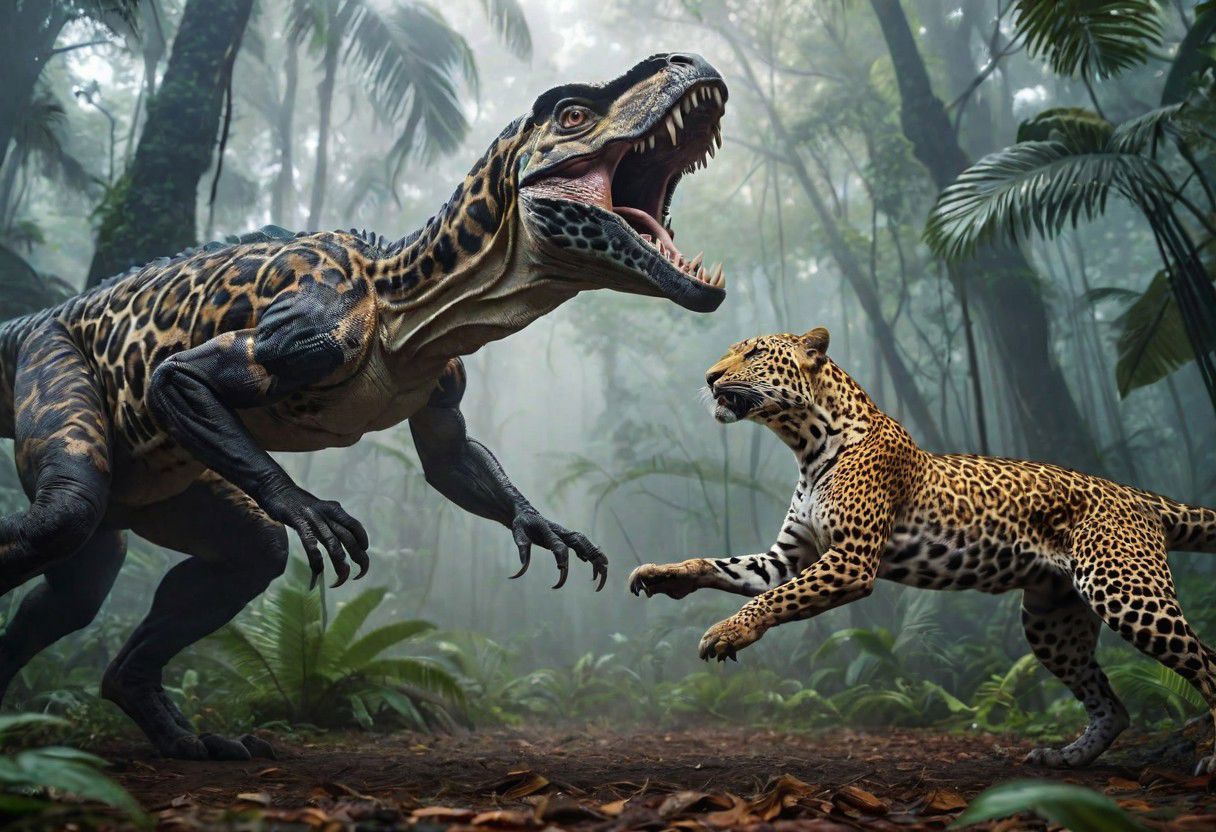 ( medium low-shot:1.2) , a velociraptor attacks to leopard in a tropical forest, cut-throat fight with each other, roaring , reflection in the eye, dark, mist, fog , space, magnetic pulse, aura, hyper realistic,(masterpiece:1.5) ,photographic reality, HDR, High resolution, cinematographic, artistic color variatons, symmetry