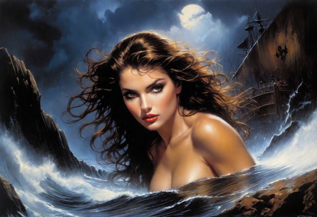 "Create a captivating movie poster for 'canvas divided in three(fantasy oil painting in the artistic Composition style of Drew Struzan:1.3), (sharp dark brown eyes, dark eye makeup, heavy makeup, long eyelashes, luscious lips, cleavage, bulbous nose, full lips, a blonde pirate:1.5) wide jaw, narrow waist, (light and shadow By Boris Vallejo and Luis Royo and julie bell:1.1)(line art by Michael Turner and J. Scott Campbell and Artgerm:1.2), (risqu glamorous pose jet black hair full lips luscious lips wide jaw narrow waist nautical siren/evil mermaid on a rock in the background), stomy weather, rain, lightning, rough sea, sailing ship in the background,' in the style of the original Star Wars trilogy.