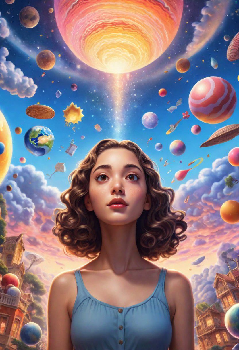 Rob Gonsalves-inspired anime poster featuring two parallel worlds where a woman divides her face, surrounded by vibrant dreams and scattered objects with warm rim light illuminating her profile against colorful backgrounds.