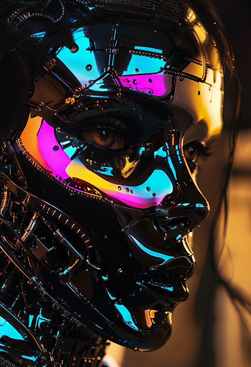 Colorful Neon ascii_art, closeup portrait, assassinkahb style, style of Guido Argentini, pureerosface_v1, amazing quality, masterpiece, best quality, hyper detailed, ultra detailed, UHD, dof, hyper-realism, majestic, awesome, inspiring, Create a highly detailed Portrait of a silver painted mechanical woman resembling Audrey Hepburn Like half human half Robot: cyborg with large thin sword, holding sword, with long black billowing hair, High collar argyle bodysuit with skull print embedded, Eerie translucent vibrant dawn behind highly volumetric fluffy translucent lighting clouds in a garden landscape with tree figures adorned., piercing the murky gloom.. cinematic composition, soft shadows, national geographic style,