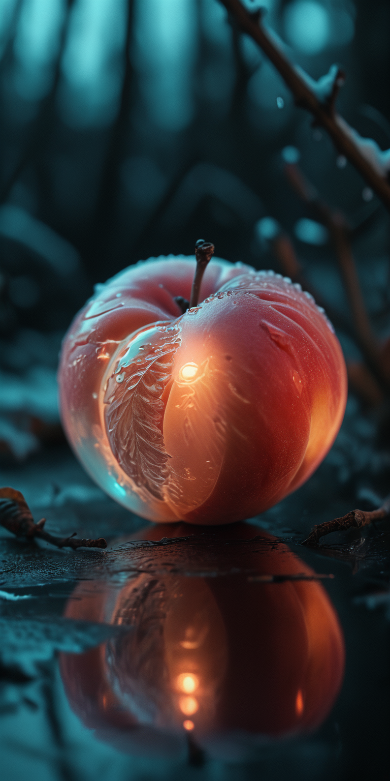 (8k analog photo,fantastical:1.2), a peach, beautiful, winter <lora:Bio-Luminescence:1> bioluminescent