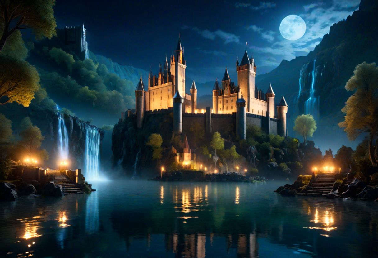score_9, score_8_up, score_7_up, score_6_up, score_5_up, score_4_up, high resolution, night, castle surrounding by mystical lake, amazing water fall in background reflecting moonlight and water looks like flamme, water reflection, style of medieval fantasy, haze on water