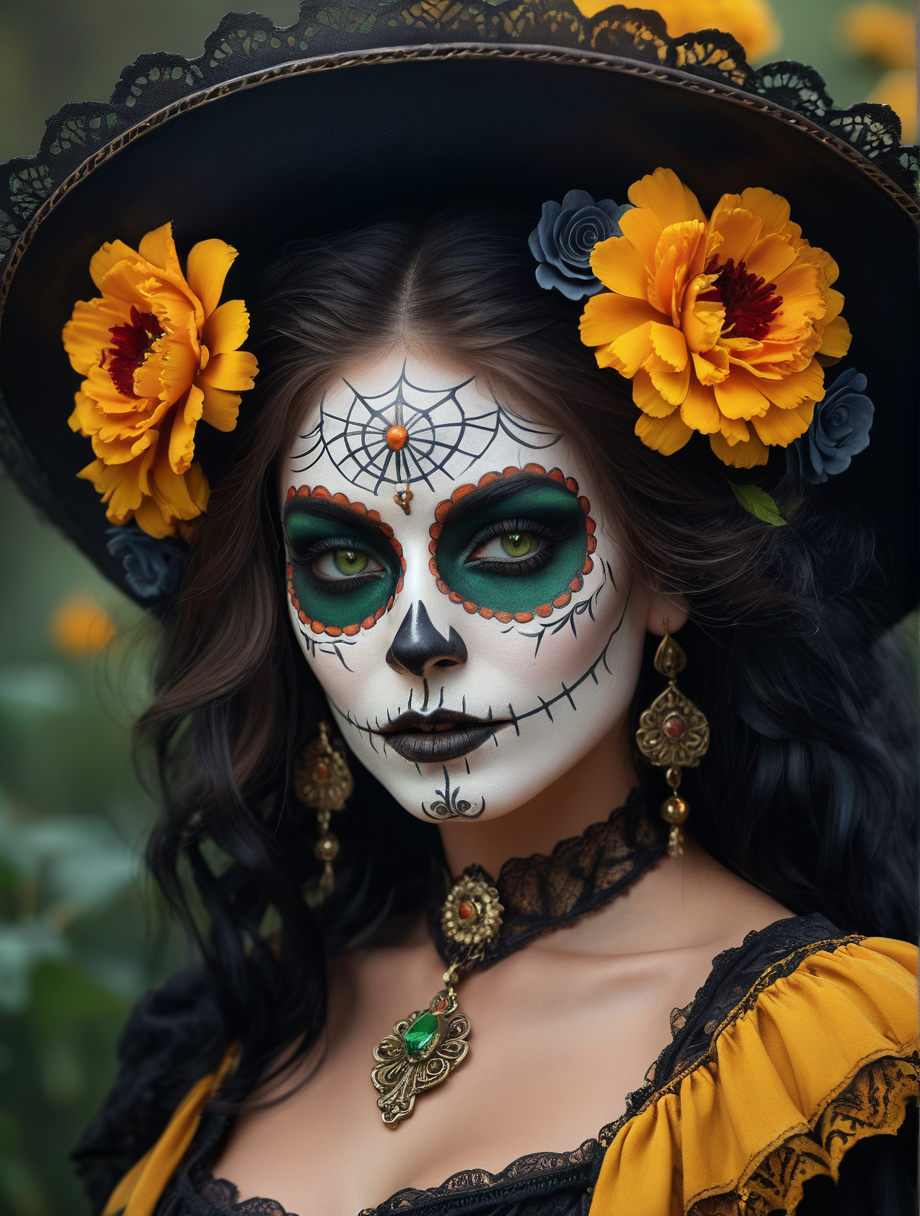 horror art, dread, glamour (cowboy shot:1.15) of a beautiful catrina girl, with an art catrina makeup, lipstick, makeup, black eyeshadow, eyelashes, smirking, flirting, (ultra detail hair:1.1), marigold flowers, ultra realistic hair, ultra detail face, green eyes, (perfect eyes, perfect face:1.1), hyperdetailed intricately detailed gothic art trending on Artstation, Unreal Engine 5 detailed matte painting, deep color, fantastical, intricate detail, splash screen, fantasy concept art, 8k resolution, gothic DeviantArt masterpiece . Extremely high-resolution details, photographic, realism pushed to extreme, fine texture, incredibly lifelike