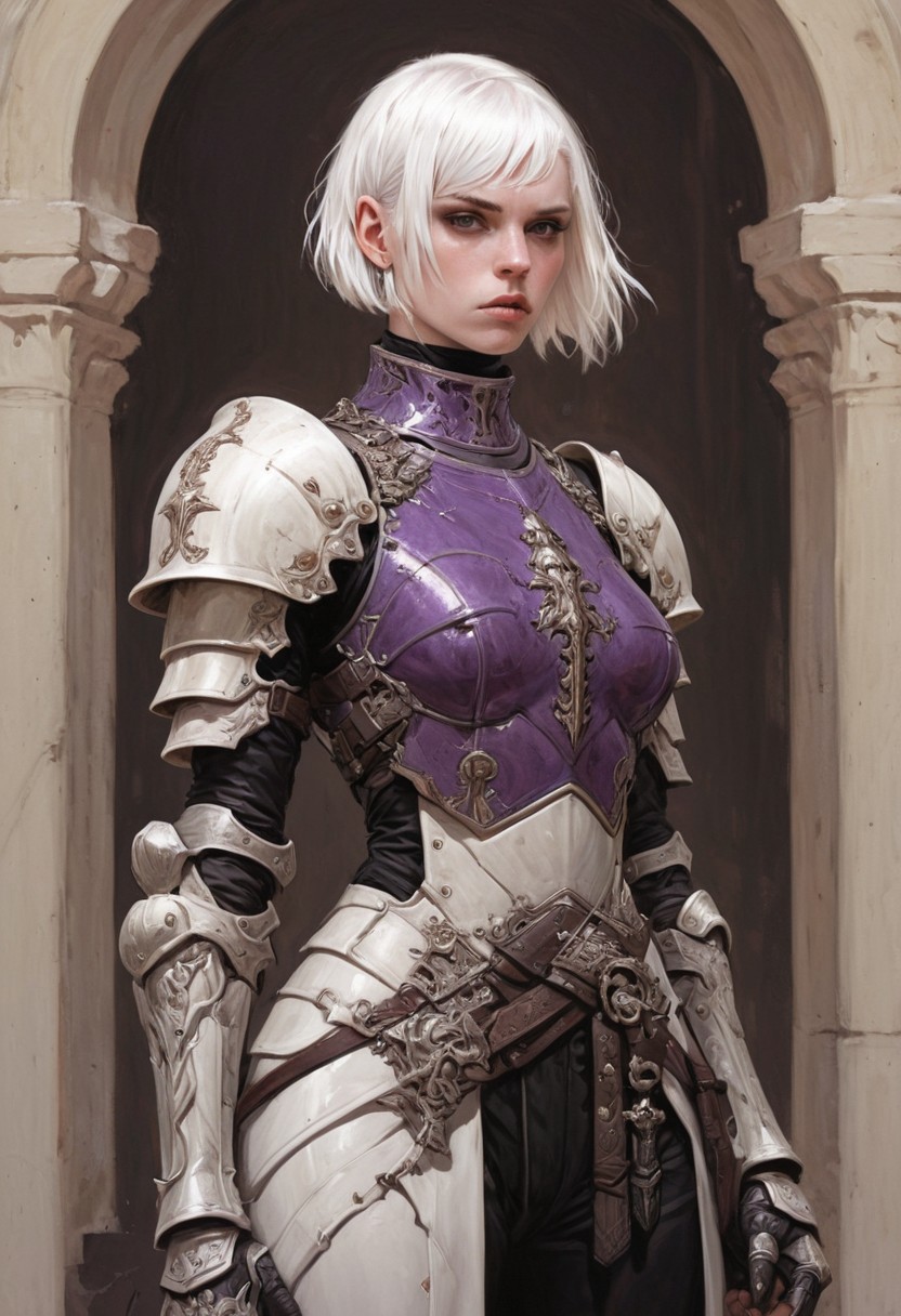 Digital illustration, detailed, full body portrait, futuristic, armored female character, pale complexion, white hair styled in a french bob, adorned in intricate purple and silver armor with leather and cloth accents, giant sword, serious expression, beautiful 21 year old woman, ear piercings, black choker,
