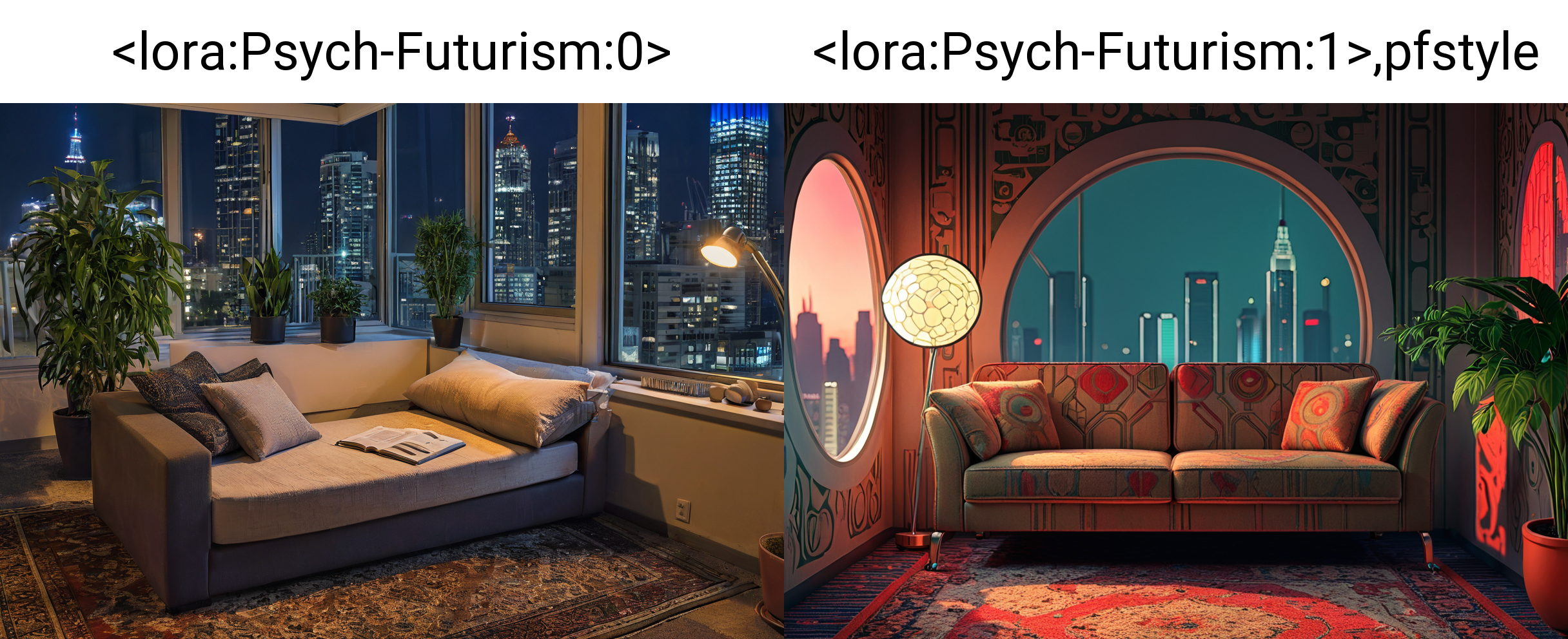 couch, scenery, potted plant, window, indoors, pillow, cityscape, city, carpet, sleeping, cushion, table, night, rug, skyscraper, lying, building, lamp, chair <lora:Psych-Futurism:0>