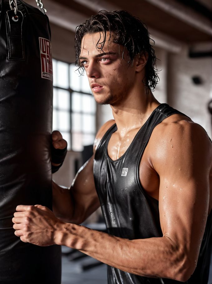 Thomas Ceccon a man <lora:Thomas-Ceccon:1>, punching a boxing bag in a grungy gym. Sweating it out, wearing a tight wet vest showing ripped biceps. Side view, high detail, realistic, 8k, depth of field, sharp focus, intricate, smooth, masterpiece, photorealistic, professional photoshoot quality, highly detailed detailed face, realistic skin, ultra-realistic, uhd, full body in frame, <lora:add-detail-xl:1>