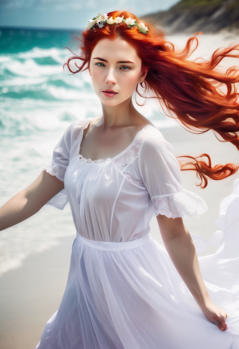 a woman in a white dress with flowers in her hair, wind kissed picture, wind kissed pictures, photo of a woman, windblown red hair, hair in wind, romance novel cover, windblown, ((30 years old woman from Cuba)), princess Ariel, womans face looking off camera, hana yata, breathtaking flower tiara, windy beach, wind in hair