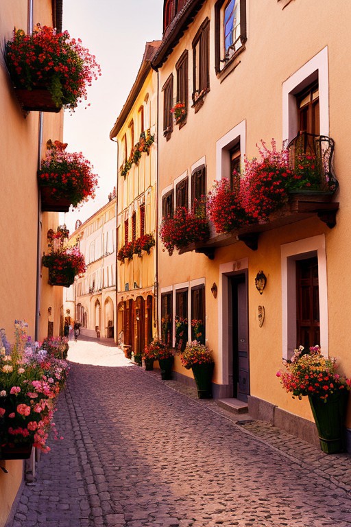 A quaint cobblestone street in a historic European town, with flowers blooming on balconies, captured in golden hour lighting., 80mm, hasselblad