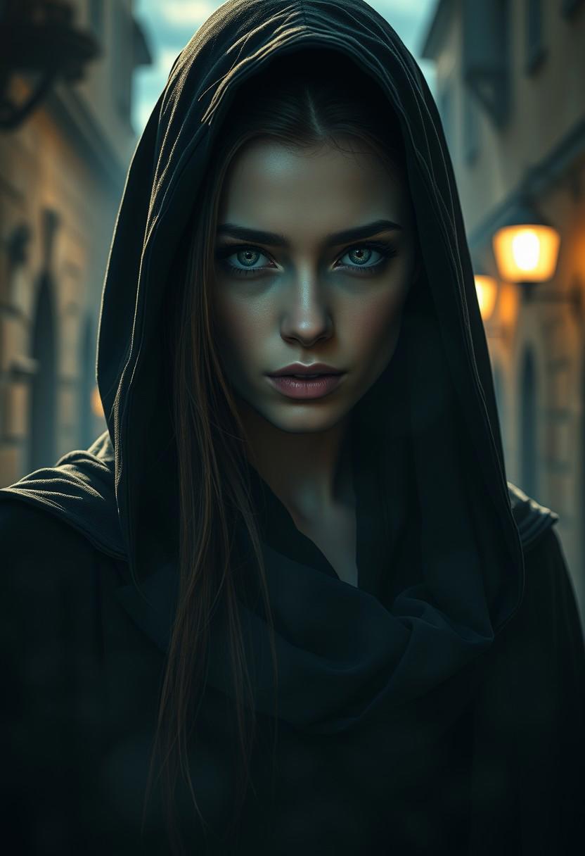 ((Vivid details)), ((Highly detailed Masterpiece)) Wlop style, Bathed in cinematic lighting, Epic Masterpiece, 64K, ((Flawless Face)), Stunning Eyes, In dramatic lighting, a stunningly mysterious female figure, Pay attention to ((face details)) and ((body)) it must be extremely beautiful and Flawless. Concept: Create a cinematic shot of Details: Clad in Dark Robes, Beautiful Assassin, Stalks Prey, Winding Streets, Medieval City | Concept: Clad in dark robes, a beautiful assassin stalks her prey through the winding streets of a medieval city | Face: Focused, Determined, Concealed | Clothing: Dark Robes, Stealthy, Concealing | Composition: Stealthy, Dangerous, Atmospheric | Pose: Moving silently through the shadows, the assassin stalks her prey with a focused and determined demeanor, ready to strike at any moment | Lighting: Dim, Moonlight Filtering Through Clouds, Casting Mysterious Shadows | Background: Winding Streets of Me