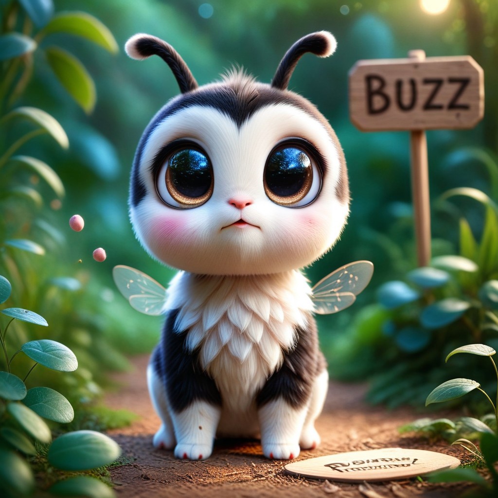 pam-swtvrld 3D-Disney-Cartoon, ein su﷿es Zwergflusspferdbaby steht wie ein Kind da, es tragt eine Schurze mit dem Namen „Happy“, seine Wangen sind rosa, seine Augen glanzen ein wenig, in seiner Hand halt es einen Pfosten mit einem runden Schild mit der Aufschrift „Buzz Me“, im Hintergrund ist ein Dschungel mit anderen Tierarten in der Ferne, Tiefenscharfe, kein Fell, background,night,full depth of field and realistic textures,highly detailed,masterpiece,high quality, 8K Ultra HD,