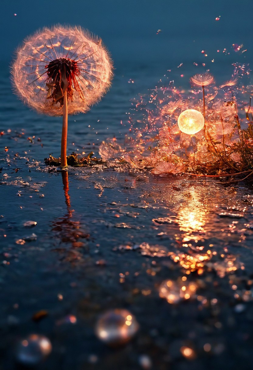 Photorealistic,There is a big crescent moon on the sea, and the road is full of light red dandelion, astral system, starry sky, fireflies, bubbles, HD,8K. Adding depth to the composition. High-contrast color, cinematic quality, high resolution, super-detailed, super-sharp focus, depth of field, and dramatic lighting and shadows., best quality, sharp focus, high contrast, stylized, clear, colorful, ultra quality, 8k, best quality, masterpiece,midjourneyv6.1
