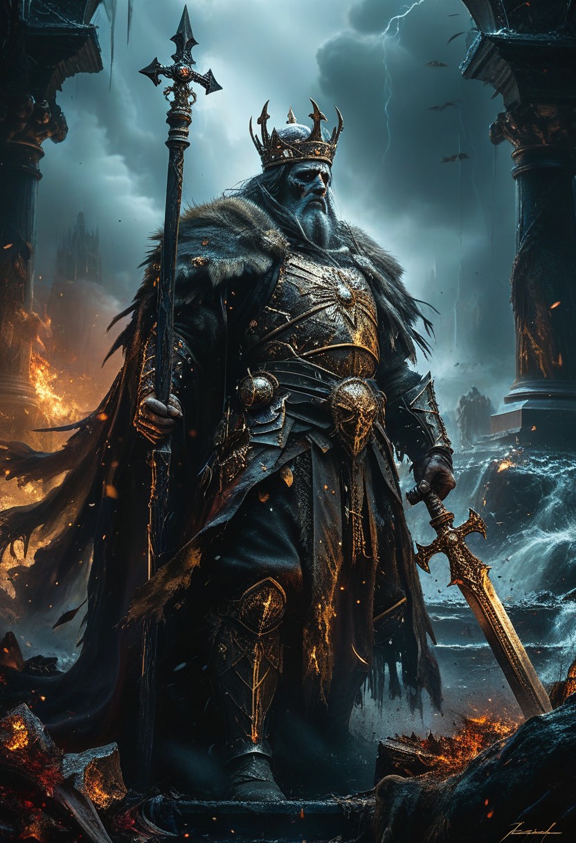 high-contrast palette, highly detailed, cinematic quality, modern art photograph, high-contrast palette, timeless feeling, cinematic quality, modern art photograph || (seven plagues, the wrath of god), (a deathless king, immortal king, army of souls), Thomas Kinkade style