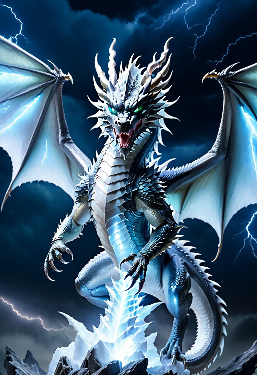 bailing_eastern dragon, Silver dragon, big wings, ((full body dragon)), magic, silver glowing, magical glow eyes, dragon ice breath, (night storm sky background), (lighting, many thunderbolt on background:1.4), (mounting background), photorealistic, Fujifilm XT3, highly detailed, extreme details, from front, raised wings,