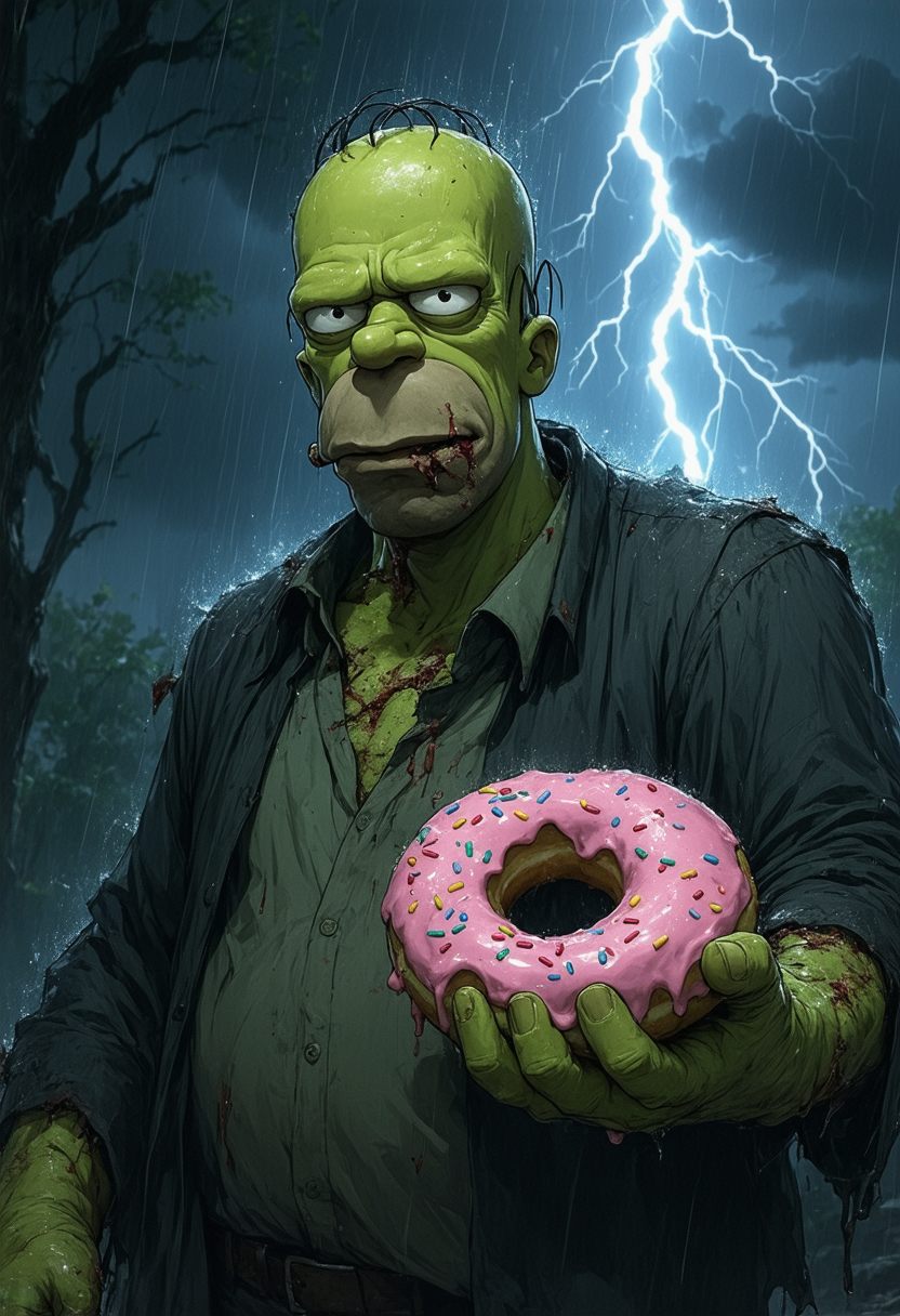 A torrential thunderstorm rages, lightning illuminating the grotesque figure of Homer Simpson, re-imagined as Frankenstein's monster. His skin is a sickly green hue, stitches crisscrossing his forehead and neck, one bolt protruding at an awkward angle. His trademark balding hair is even more sparse and disheveled, and his eyes bulge with a mixture of hunger and confusion. Clutched in his oversized, bolted hand is a half-eaten sprinkled doughnut, pink frosting smeared across his monstrous jowls. Rain lashes down, plastering his tattered clothes to his hulking frame. The background is a blur of wind-whipped trees and flashes of lightning, the thunder echoing like a monstrous growl. Despite the horror, a flicker of Homer's familiar dopiness remains, making the scene both terrifying and absurdly funny. This is a monstrous parody, a collision of classic horror and iconic cartoon imagery. The style evokes the bold lines and lurid colors of a classic EC Comics horror panel, with a touch of Matt Groening's signature caricature style. The desired emotion is a blend of fear and amusement, a grotesque comedy rendered with a dark, saturated color palette and dramatic lighting to emphasize the stormy atmosphere and Homer's monstrous transformation.