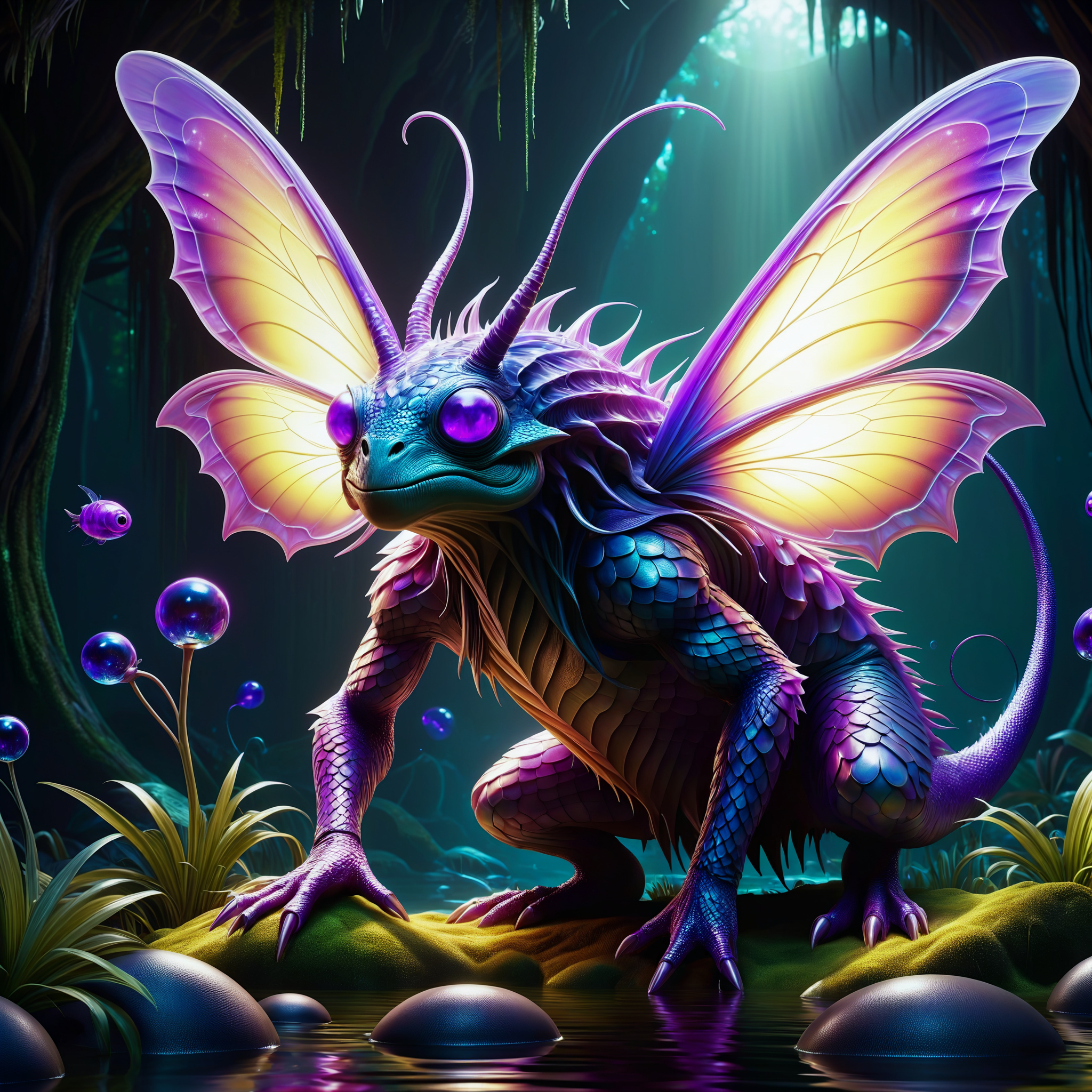 detailed background, glowing eyes, famous artwork inspired by (michael whelan:1.2) and (anne stokes:1.4) and (phil foglio:1.1) and (jae cheol park:1.1), (dramatic scene:1.2), (fractal art:0.5), high scifi style, dynamic angle, this (bioluminescent life form:1.2), the "displeased grieveflibber" covered in purple iridescent scales, with its iridescent hide hunts anderful (colorful insects:1.3) in the hazy life-teeming swamps on planet "gromflom vi", its whippletorbig body casting a soft, pulsing glow on the regorbified surroundings, (creature focus:1.2), dappled lighting, subsurface scattering, golden ratio, realistic, highly detailed, 8k, uhd, [:evil villain, p1nk1r1sc4l3s, :12] <lora:style-iridescent_scales-xl-by_pinkielicious:0.4> <lora:lyco-style-envydramaticlightingxl01_digital_art-xl:0.48> <lora:evil_villain_slider-by_ntc:3.0>