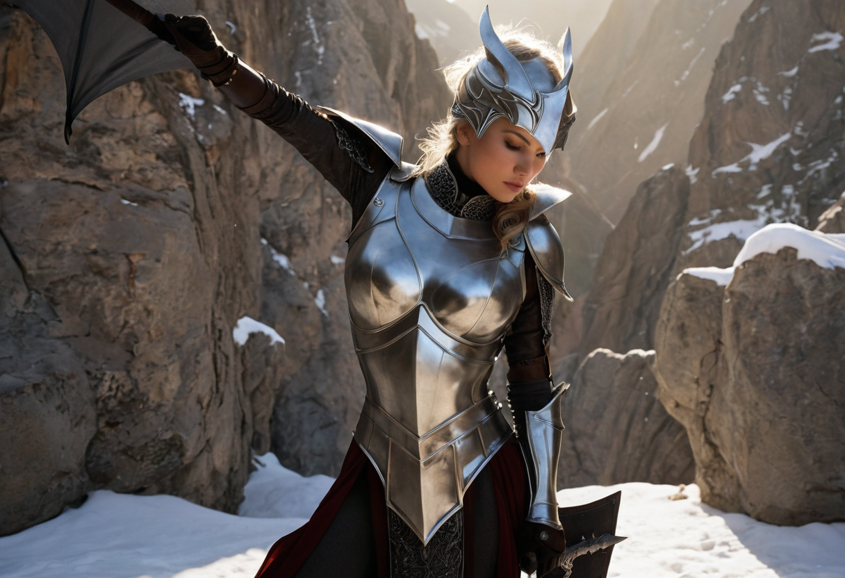photograph This image is a highly detailed CGI fantasy scene depicting a lone female dragon knight atop a snow-covered mountain peak. The knight, clad in full medieval armor, features an athletic build and a fierce, determined expression. The armor is a mix of silver and black, with intricate designs and a polished, reflective texture. The knight's helmet is silver with a visor that covers the face, adding a touch of mystery, 50mm . cinematic 4k epic detailed 4k epic detailed photograph shot on kodak detailed cinematic hbo dark moody, 35mm photo, grainy, vignette, vintage, Kodachrome, Lomography, stained, highly detailed, found footage, The dragon's wings are expansive, with a rich, dark brown color that contrasts sharply with the knight's armor. The wings are spread wide, displaying their leathery texture and intricate veins. The dragon's body is sleek and covered in scales that shimmer slightly, giving it a regal and formidable appearance, The background is a stunning mountainous landscape under a cloudy sky. The mountains are jagged and snow-capped, with deep valleys and distant peaks. The sky is overcast with thick, grey clouds, casting a soft, diffused light over the scene. The contrast between the knight's armor and the natural elements in the background creates a dramatic and epic atmosphere, emphasizing the sense of isolation and adventure, This image is a highly detailed CGI fantasy scene depicting a lone female dragon knight atop a snow-covered mountain peak. The knight, clad in full medieval armor, features an athletic build and a fierce, determined expression. The armor is a mix of silver and black, with intricate designs and a polished, reflective texture. The knight's helmet is silver with a visor that covers the face, adding a touch of mystery, cinematic, dynamic, epic, imaginative, creative, positive, romantic, pretty, pure, attractive, fine detail, amazing color, flowing colors, light, rich deep vivid colorful saturated complex strong dramatic atmosphere, iconic, perfect composition, aesthetic, very inspirational, stunning, inspired, professional, winning, awarded, extremely, clear, beautiful