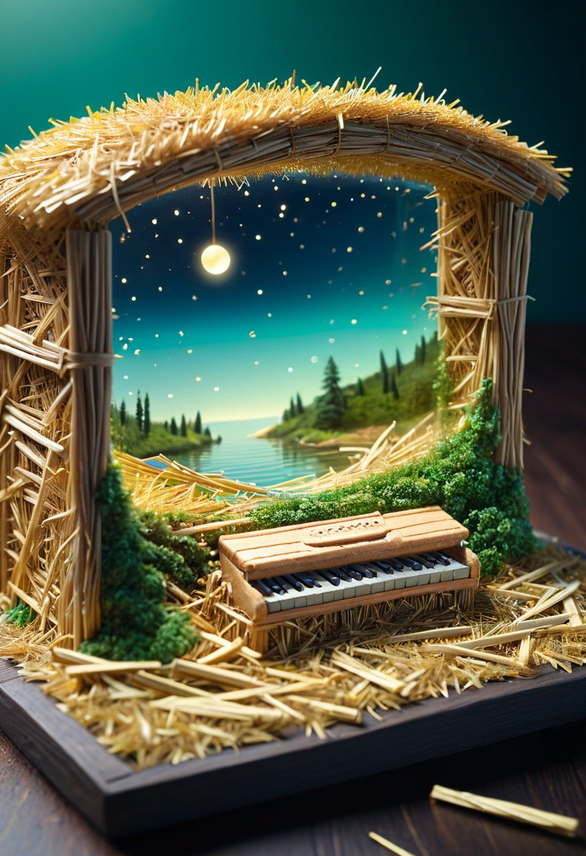 masterpice, absurdes, best quality, HDR photo, outdoors, in the lake made of straw, tilt-shift angle, cute, <lora:Straw_thread:1> diorama, integrated chips art object of harmonica looks like glass (made of hay and straw :1.5) and gold, Dark Green lights, detailed, ultrarealistic,ultradetailed,play of light, reflection, refraction, Raytracing, <lora:add-detail-xl:0.5>, score_9, score_8_up, score_7_up, score_6_up,, masterpice,