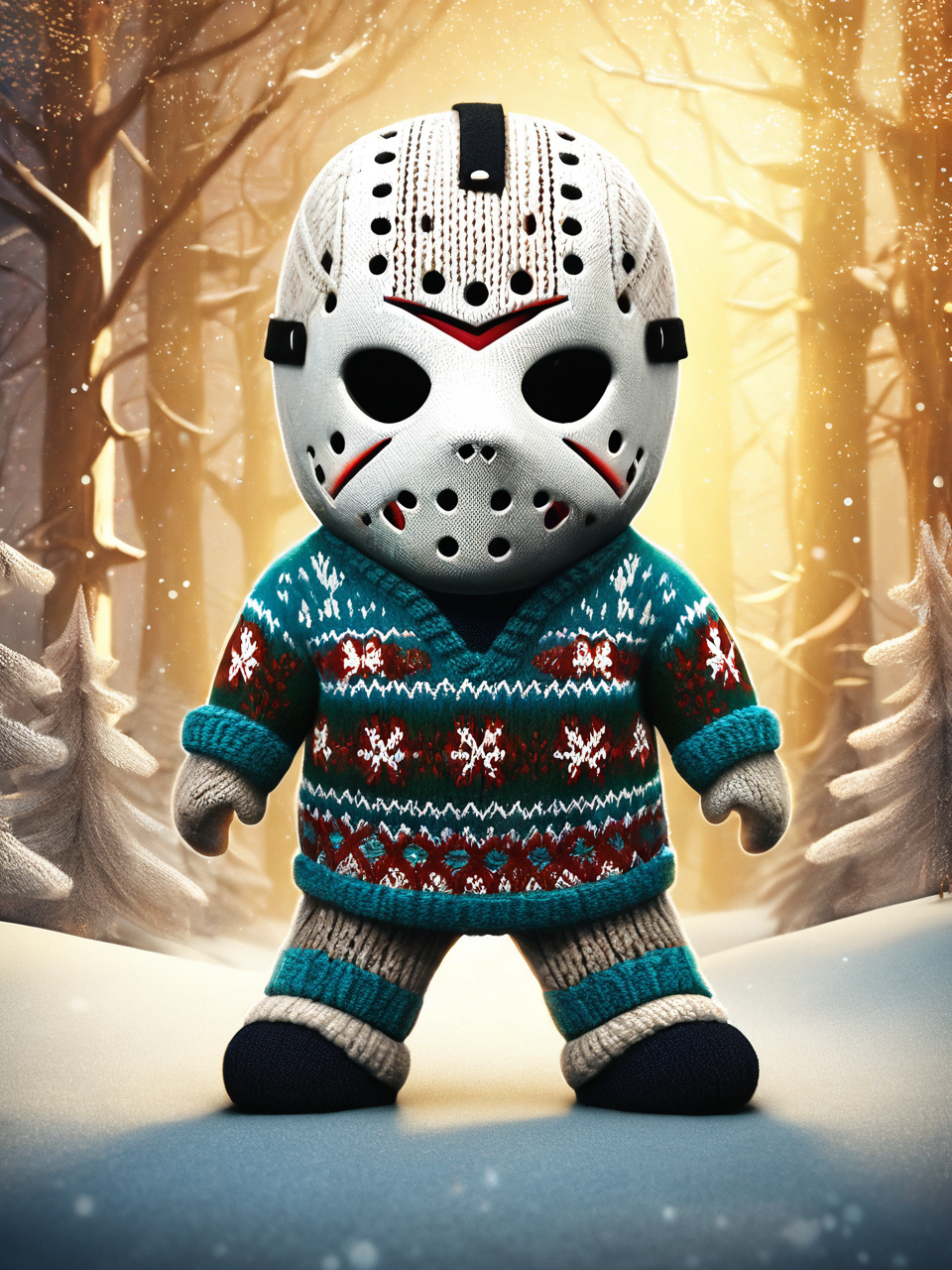 <lora:SDXLChristmasSweater:0.7> christmassweater, Christmas theme, highly detailed dynamic shot of a cute Jason Voorhees, ,complementary colors, highly detailed forest wallpaper background, high quality, makeship, soft and warm lighting, cozy atmosphere, <lora:Makeship_Pony_v1:0.7>