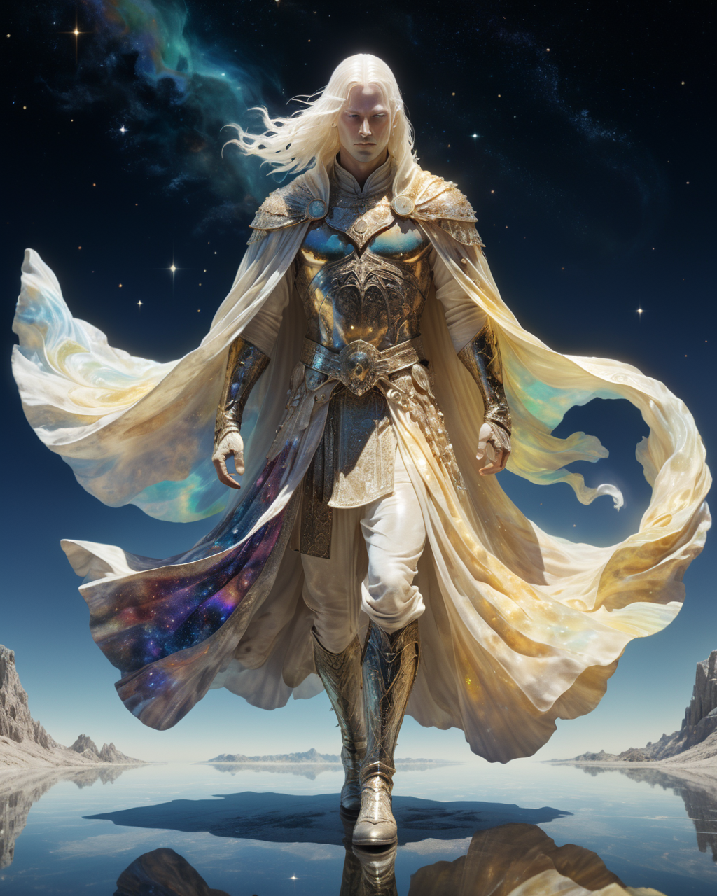 (detailed illuminated alabaster face:0.7), Male warrior, flowing cosmic nebulous, cloak, windy, full body, Magical city of Tanelorn, (Kay Nielsen:0.4), (volumetric lighting:1.1), shadows, holographic, water, reflections, transparency, prismatic colors, iridescence, stars, ultra resolution, sunny sky, realistic photo, <lora:add-detail-xl:0.75>, <lora:xl_more_art-full_v1:0.5>