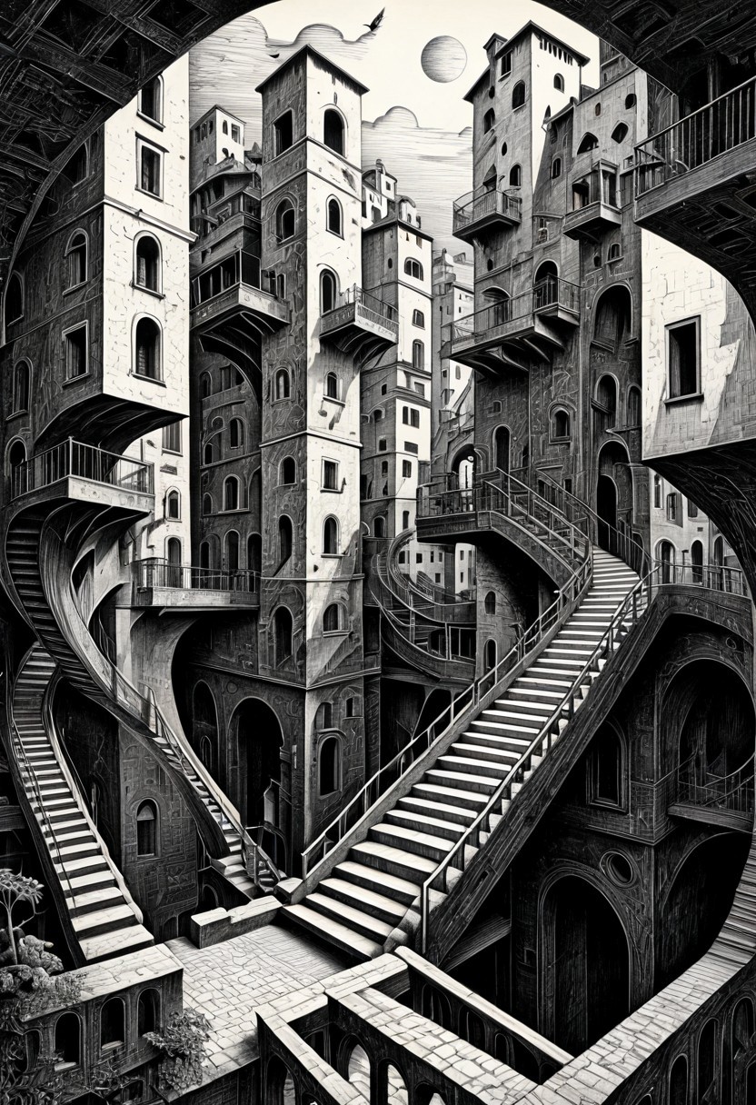 (surrealist ink drawing:1.5), (M.C. Escher), (intricate cross-hatching:1.6), (impossible architecture:1.7), (labyrinthine cityscape:1.6), (staircases leading to nowhere:1.5), (floating bridges defying gravity:1.6), (black-and-white high-contrast shading:1.5), (optical illusion depth:1.7), (distorted perspective:1.6), (doorways opening into the void:1.5), (ethereal lighting casting shifting shadows:1.6), (surreal dream logic:1.7), (geometrically complex:1.5), (esoteric and mind-bending atmosphere:1.6), (hyper-detailed pen strokes:1.7), (mathematically precise yet chaotic:1.6), (otherworldly:1.5), (darkly elegant:1.6), (legendary surrealism:1.7).
