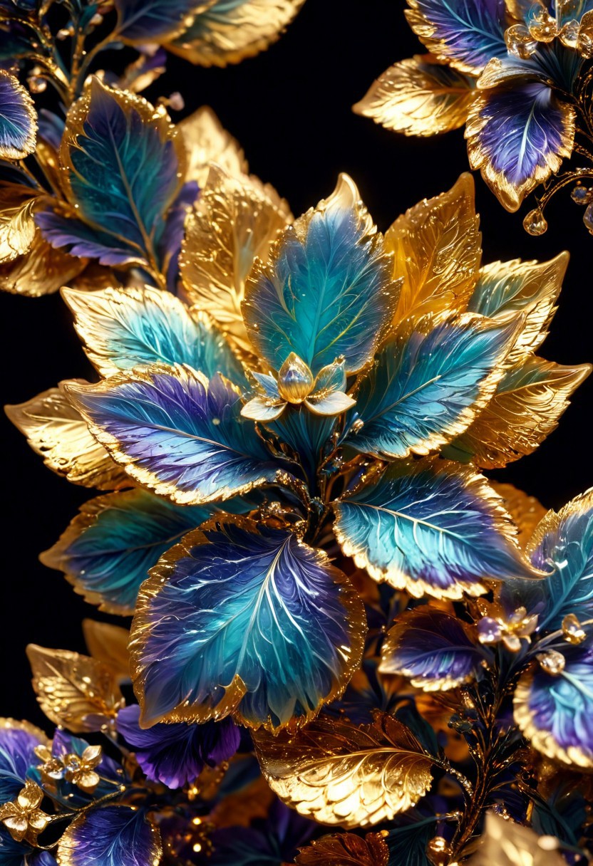 masterpiece,(best quality), official art,extremely detailed cg 8k wallpaper, hyper detailed, (golden 3d print plant ), vibrant glow, sparkles, glitter, elaborate, (extremely delicate and beautiful),highly detailed, midjourneyv6.1, fluorite mineral, flu0rite, iridiscent, WhiteMold , black background