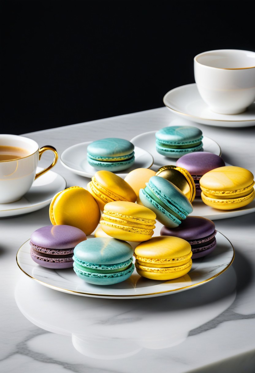 4k, ultra highres, fluorite Colorful gold Liquid Marble macarons lined up, A simple cafe table and white plates, minimalist,