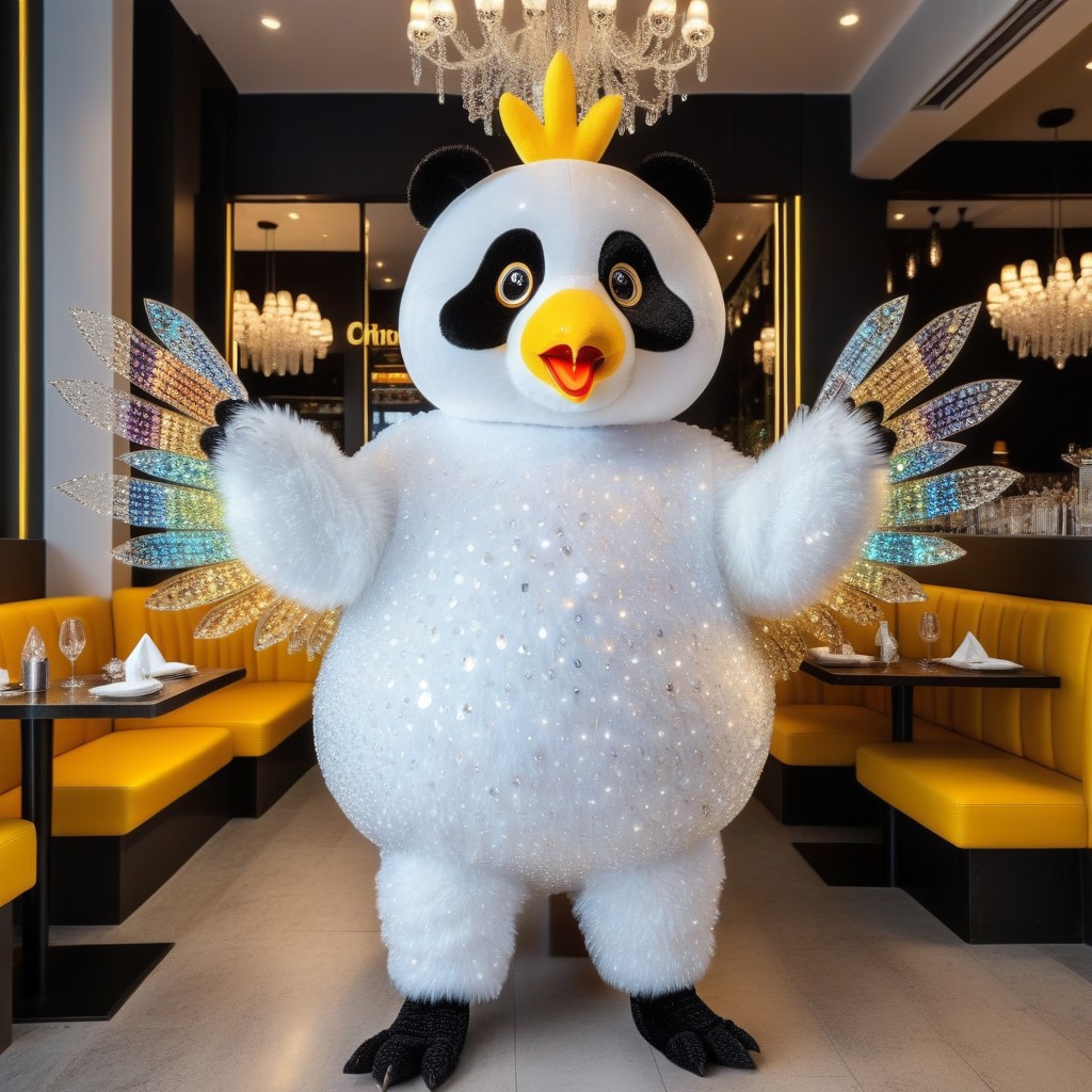 A panda wearing full-body chicken (((costume made of crystals))) at the restaurant, detailed costume, crystals shape costume, white costume, chicken shape costume, realistic crystals textures, dynamic pose, vibrant colors, detailed environment, restaurant ambiance, panda at the restaurant
