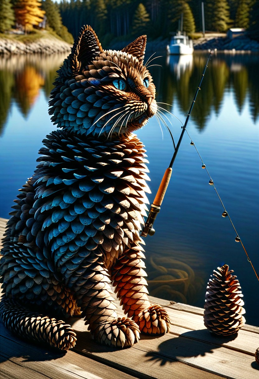 masterpice, absurdes, best quality, HDR photo, artist: Andrew Wyeth, <lora:ral-pinecone:1> ral-pinecone, cat with science fiction collectible figure of smooth puppy made of and steel, Blue lights, detailed, ultrarealistic,ultradetailed,play of light, reflection, refraction, Raytracing, <lora:add-detail-xl:0.5> <lora:sdxl_lightning_8step_lora:0.3> Lakeside Dock, rippling water, gentle waves, warm sunlight, fishing rods, quiet conversations,,, masterpice,, score_9, score_8_up, score_7_up, score_6_up,