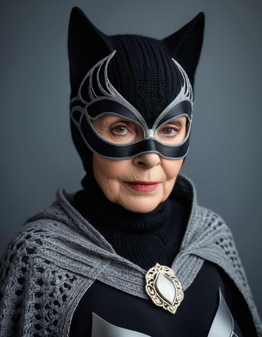 Portrait photography of an elderly woman dressed in the style of The Cat Woman, in a knitted costume with cape and mask made from wool in balck, steel, and silver colors, against a solid grey background, taken with a Hasselblad X1D 65mm wide-angle lens -- ar 9:16., (intricate details:1.12), hdr, (intricate details, hyperdetailed:1.15), (cinematic look:1.4), soothing tones, insane details, intricate details, hyperdetailed, low contrast, soft cinematic light, dim colors, exposure blend, hdr, faded, slate gray atmosphere