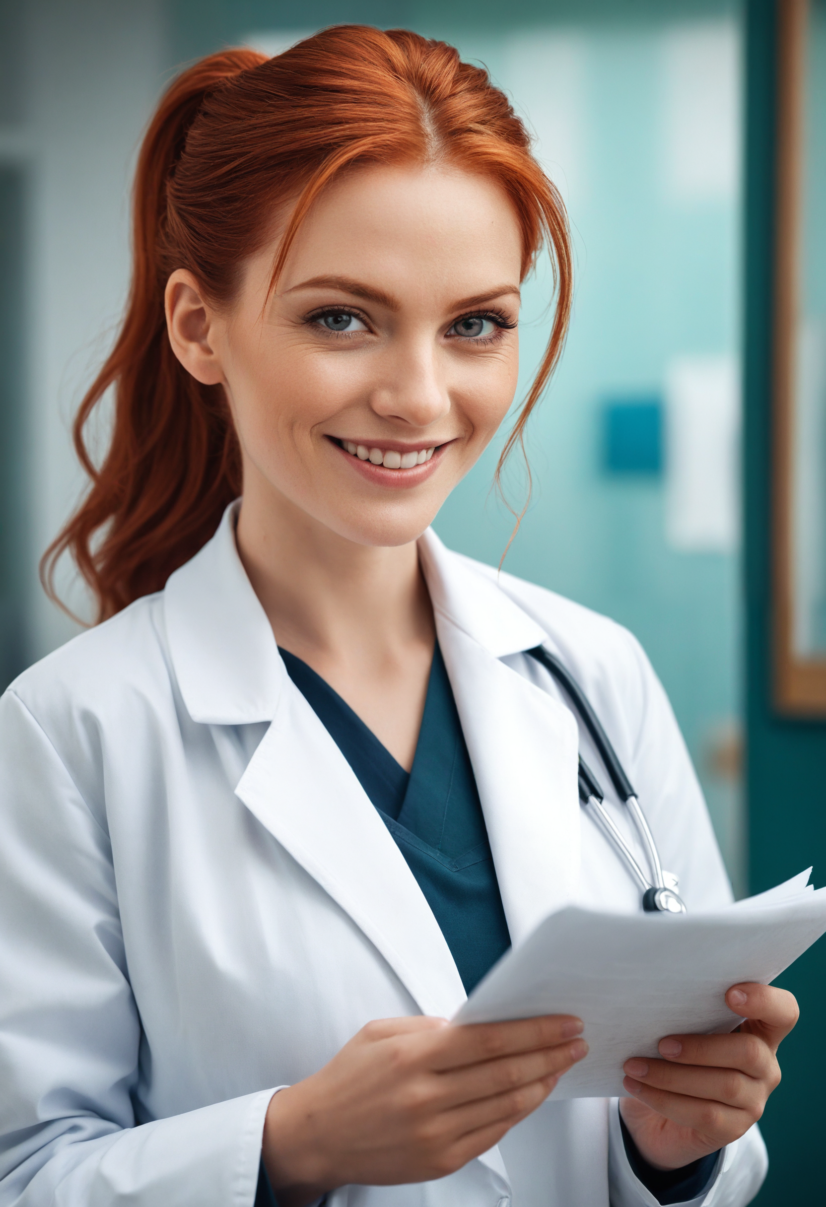 photorealistic, breathtaking detailed, masterpiece, absurdres, awe-inspiring, radiant, photo of beautiful woman, 30 years, red hair pulled back in a ponytail, wearing a white doctor's coat, looks at the camera, smiling, papers in her hands, Mirrorless<lora:sdxl_add-detail-xl.safetensors:1.5:1.5>