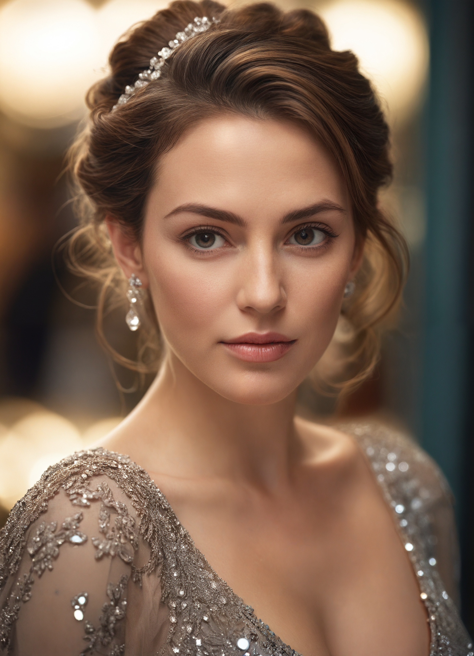 photorealistic, breathtaking detailed, masterpiece, absurdres, awe-inspiring, radiant, photo of beautiful woman, 35 years, brown hair pinned up, wearing a glimmering dress, looks in the distance, light smirk, Mirrorless, 35mm lens, f/1.8 aperture, ISO 400, slight color grading<lora:sdxl_add-detail-xl.safetensors:1.5:1.5>